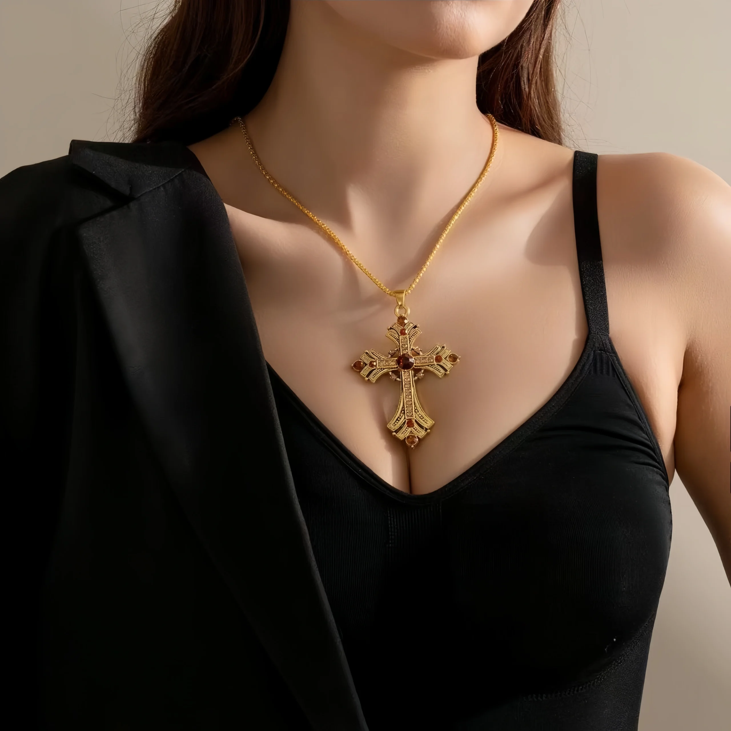 Crafted with a golden cross design, the pendant features radiant red gemstones at its center and four edges. These gems symbolize passion, vitality, and divine love. The vintage-style detailing highlights the balance between tradition and modern fashion, making it a versatile piece for both spiritual and aesthetic expression.
