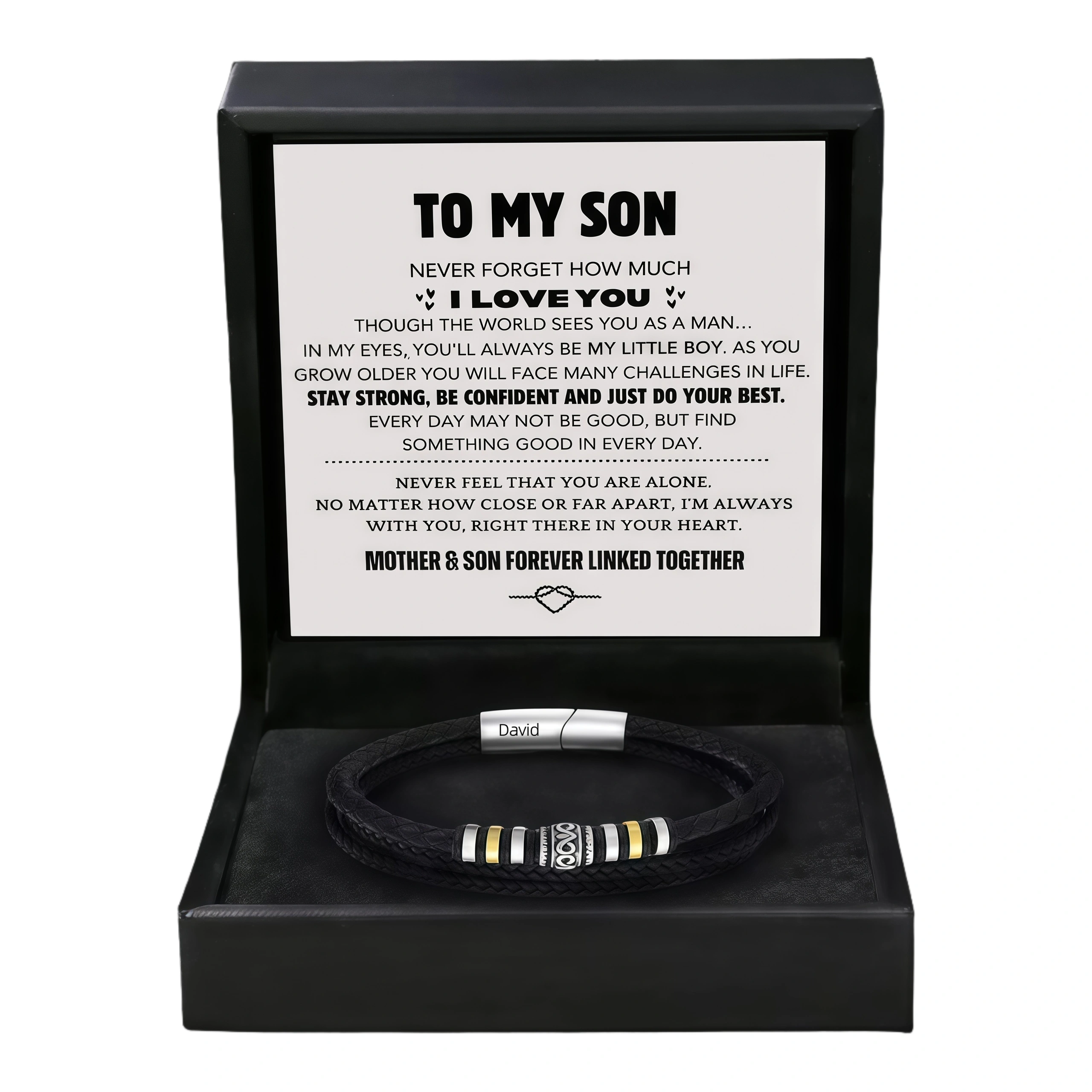 Your son will receive a warm, personalized gift brimming with affection that is sure to bring a smile to his face—and perhaps even a tear of emotion. A gift that carries your heartfelt intentions. This gesture lets him know you always think of him and hold him close in your heart. Whenever he wears this bracelet, the memories you’ve created together will forever be etched in his heart.